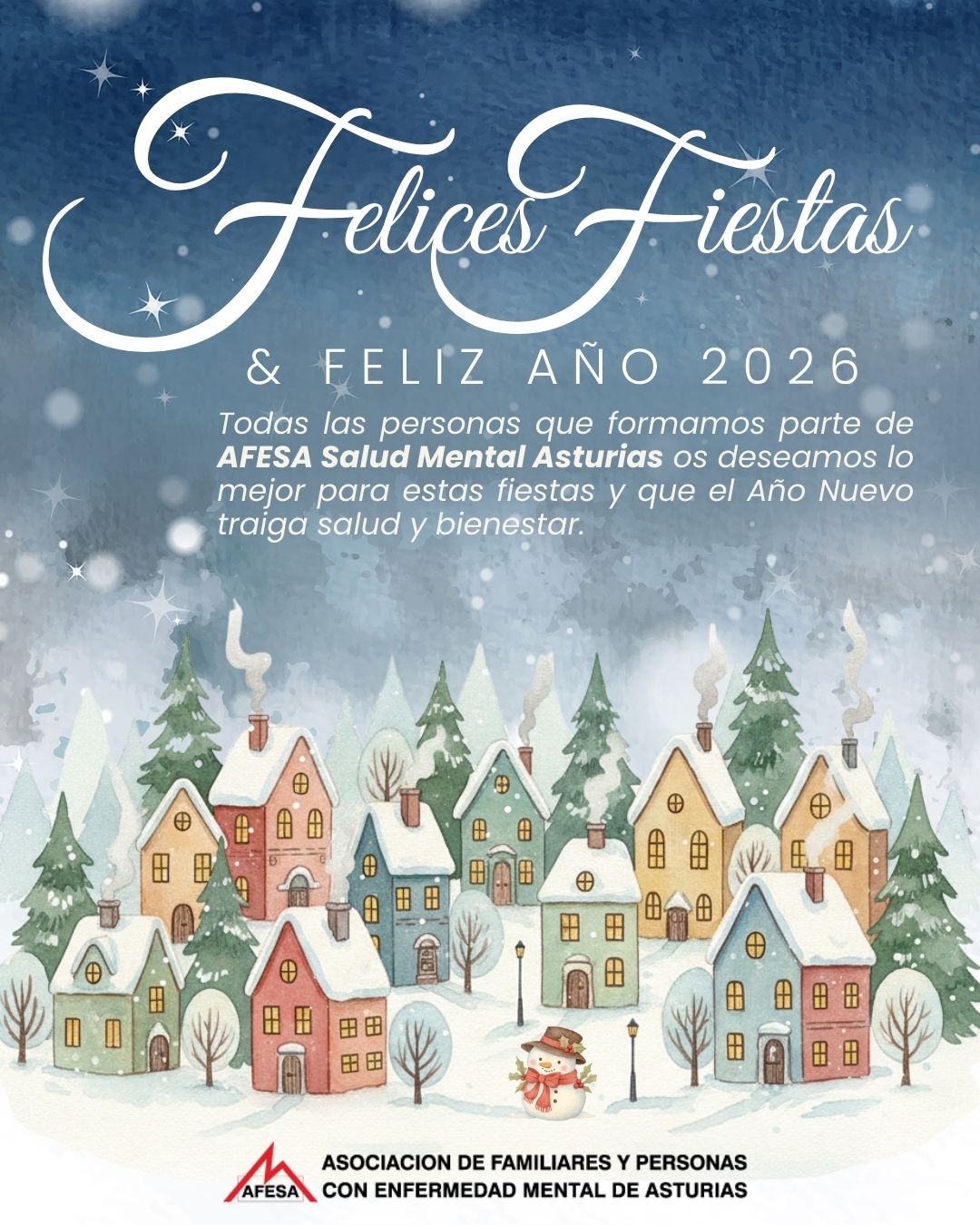 A todas las personas que participan en nuestros programas y proyectos, a las familias que nos acompañan en el día a día, a nuestro equipo de profesionales, juntas directivas, voluntarios y colaboradores, a otras entidades amigas... En definitiva, a todas las personas que habéis estado a nuestro lado este año ¡Felices fiestas! Gracias por vuestra confianza, compromiso y por compartir grandes momentos juntos. Os deseamos que estas fiestas os traigan mucha paz, salud y tiempo de calidad para disfrutar de las personas que más queréis. Desde AFESA Salud Mental Asturias os enviamos nuestros mejores deseos y todo nuestro cariño.