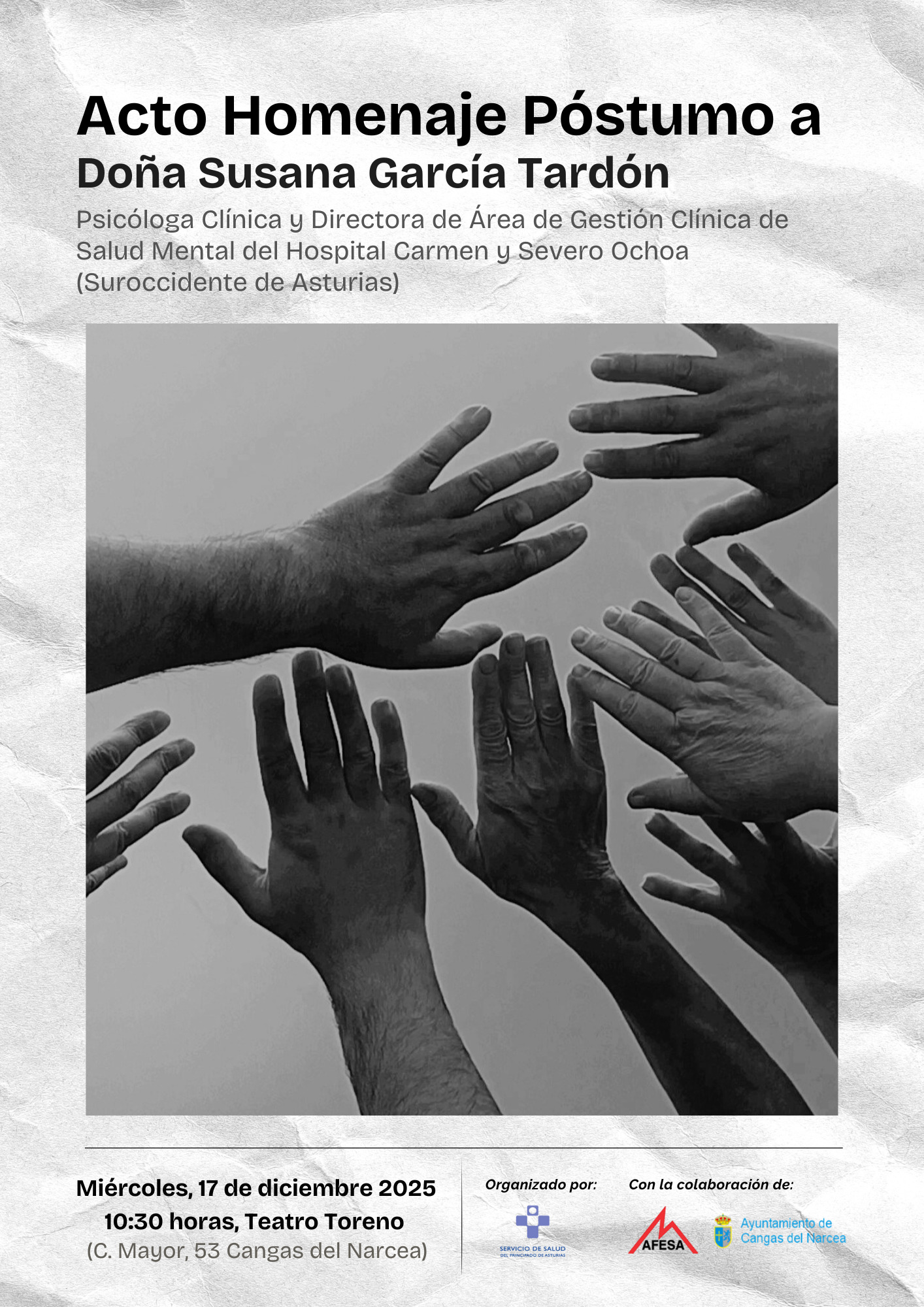 Este miércoles 17 de diciembre, a las 10:30 horas, el Teatro Toreno de Cangas del Narcea acogerá un homenaje póstumo a Susana García Tardón, una profesional que nos deja una huella profunda tanto en las personas a las que acompañó desde su labor profesional como en quienes compartieron parte de su camino.